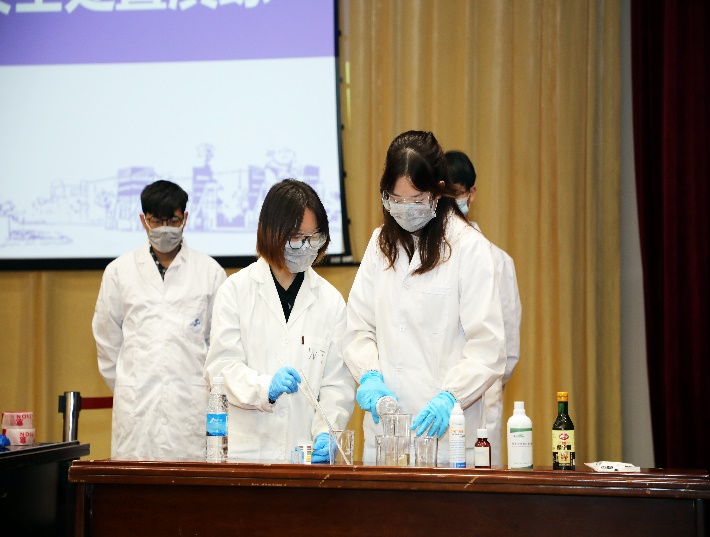 在演练现场模拟一间化工实验室环境,还原实验人员误将装有乙醚、丙酮溶液的混合废液打翻后,发生泄漏、实验人员身上被大量喷溅化学试剂的安全事件。学校资实处、保卫处、学院负责人、实验室师生等相关人员“本色出演”,模拟演练了实验室挥发类有毒化学品及废液泄漏安全事件发生后的学生自救、警戒隔离、医疗救护、事故上报、应急决策、应急安全处置、应急恢复等一系列应急安全处置的过程。屈老师结合演练的各个节点进行了讲解、点评和复盘,参演同学分享了应急处置方法和使用材料的思考。